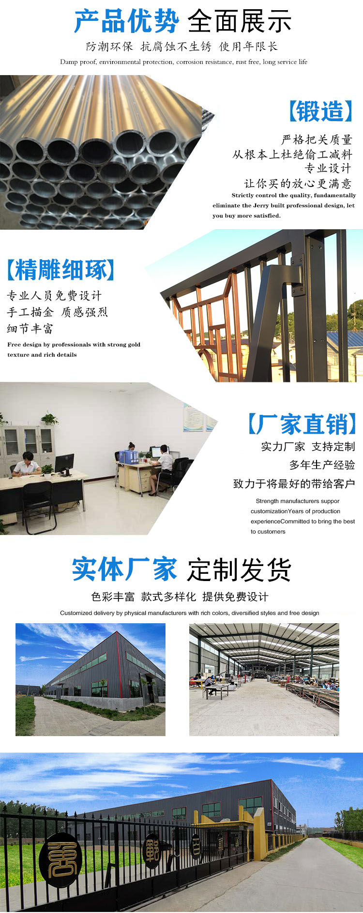 時(shí)代轉(zhuǎn)變現(xiàn)代潮流,百斯特二代新產(chǎn)品鋁藝:門、樓梯、圍欄、護(hù)窗等產(chǎn)品上 市,表面涂色后和鐵藝一樣的效果,其優(yōu)點(diǎn)是不生銹,安裝、運(yùn)輸、施工輕便,省時(shí) 省工,二次回收使用率高。公司經(jīng)多年研發(fā)試驗(yàn),從鋁的材質(zhì)、加熱、調(diào)整、焊 接、打磨、噴涂等工藝,都有著豐富的技 術(shù)經(jīng)驗(yàn),把產(chǎn)品推向市場,讓客戶使用新 的產(chǎn)品氣息。